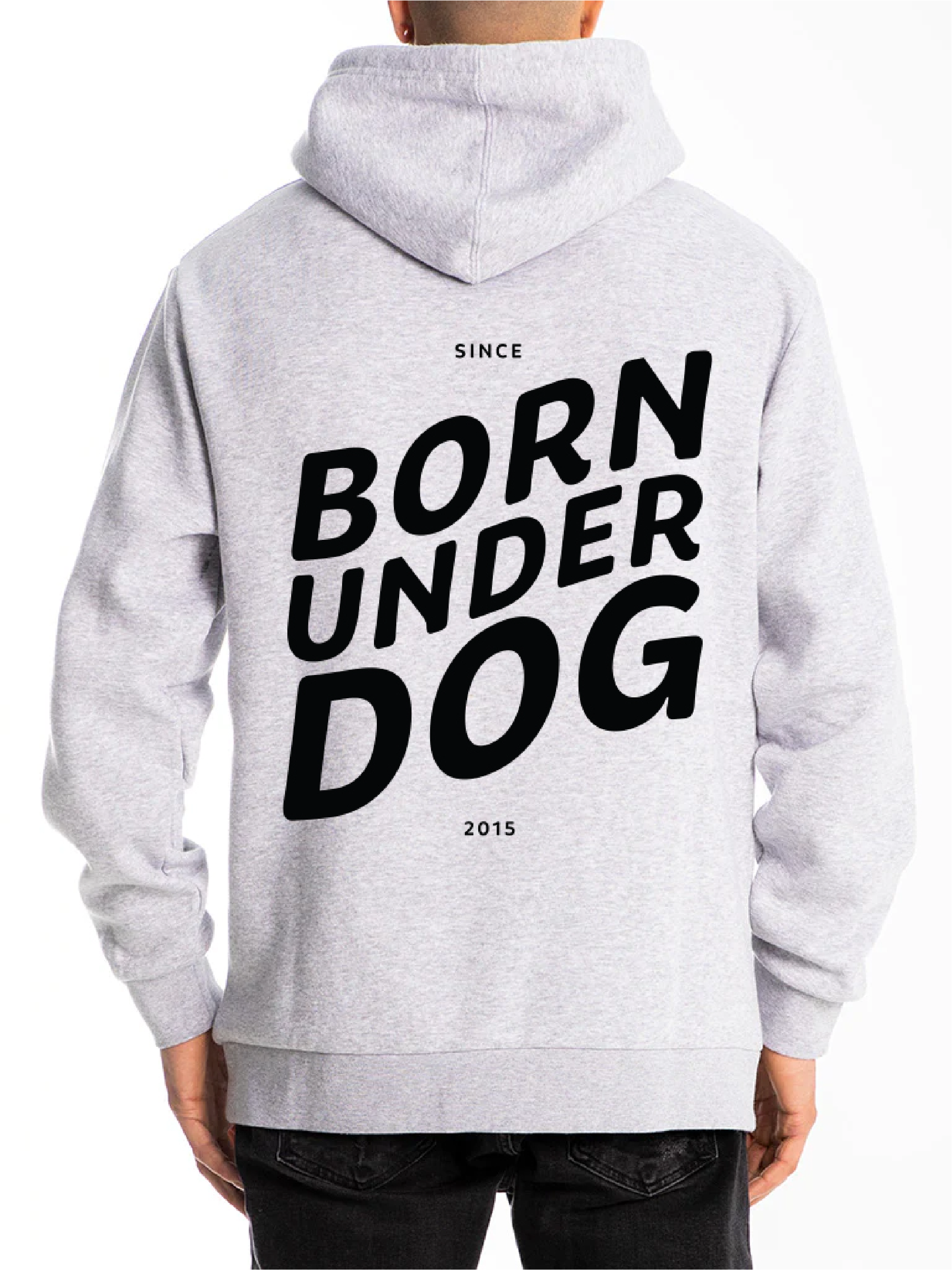The grey hoodie is crafted with attention to detail, using high-quality materials to ensure comfort and durability. It features a relaxed or slightly fitted silhouette, providing a laid-back and effortless look that is characteristic of Born Underdog's style.